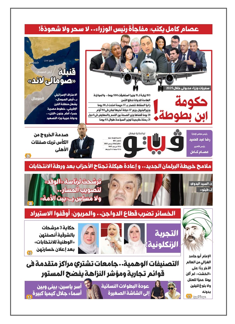 كانت فيتو قد نشرت في عددها السابق ملفا عن الزيارات الخارجية التي قام بها وزراء حكومة مدبولي في عام واحد فقط، حيث قطع وزراء حكومة الدكتور مصطفى مدبولى آلاف الكيلومترات عبر مطارات العالم، فى تحركات خارجية لم تعد استثناء تفرضه، بل تحولت لدى بعضهم إلى نمط ثابت.. رصد تحركات الوزراء خلال عام ۲۰٢٥ يكشف عن تصدر د. رانيا المشاط وزيرة التخطيط والتنمية الاقتصادية والتعاون الدولي قائمة السفريات الخارجية، بإجمالى ۳۷ زيارة استغرقت ٩٠ يوما. كما سجل كريم بدوي، وزير البترول، رقما لافتا من السفريات، إذ قضى نحو 10 أيام خارج البلاد، واصطحب معه في إحدى الزيارات نحو ١٥٠ من قيادات البترول والشركات التابعة.