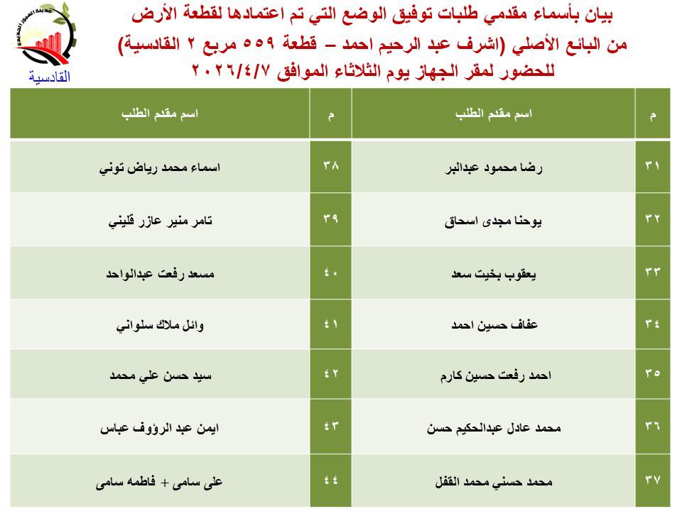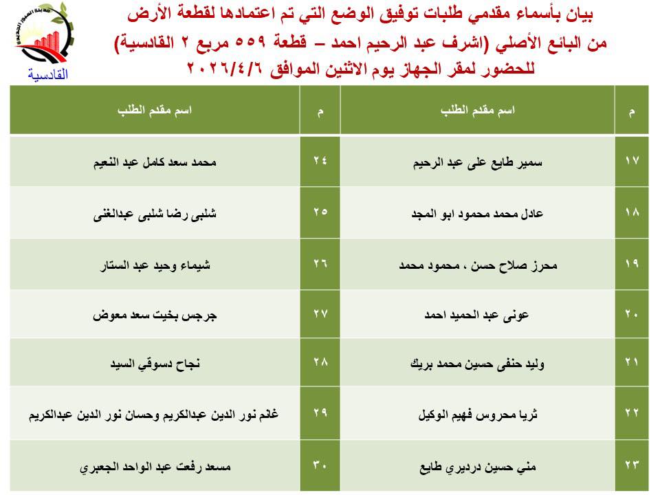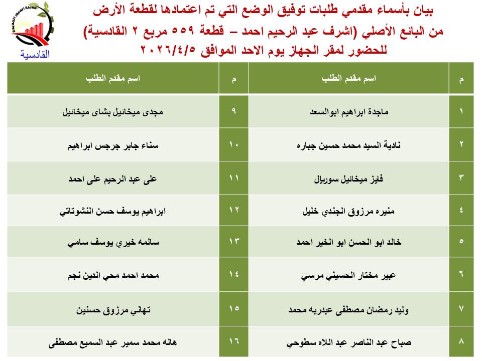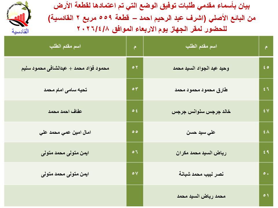 كشفت وزارة الإسكان والمرافق والمجتمعات العمرانية عن تقنين دفعة جديدة من أراضي المواطنين بمنطقة القادسية بمدينة العبور الجديدة، الذين تم اعتماد توفيق أوضاع أراضيهم لاستكمال إجراءات التقنين.