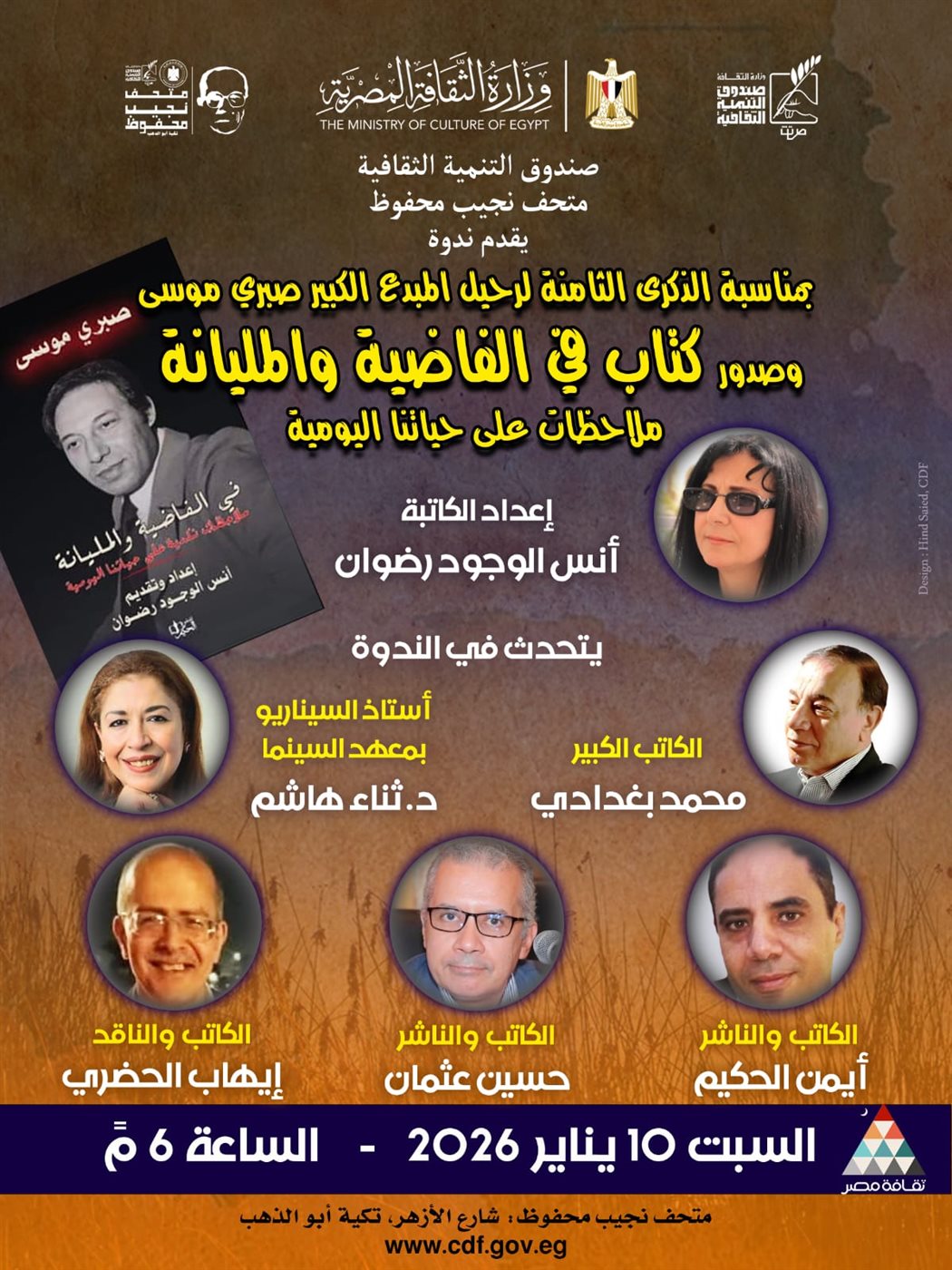 تُقام في السادسة من مساء السبت المقبل ندوة موسعة، في متحف نجيب محفوظ، بمشاركة نخبة من المثقفين والأدباء والشخصيات العامة، وذلك بمناسبة الذكرى الثامنة لرحيل المبدع الكبير صبري موسى، وبالتزامن مع صدور كتاب «في الفاضية والمليانة.. ملاحظات على حياتنا اليومية».