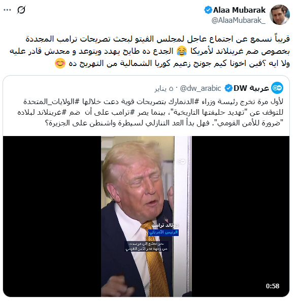 وجاء تعليق علاء مبارك، الساخر، ردًا على تقرير إعلامية غربية، تفيد بأن "رئيسة وزراء الدنمارك خرجت لأول مرة بتصريحات قوية، دعت خلالها الولايات المتحدة بالتوقف عن "تهديد حليفتها التاريخية"، بينما يصر ترامب على أن ضم جرينلاند لبلاده "ضرورة للأمن القومي"، وتساءلت التقارير الغربية: "هل بدأ العد التنازلي لسيطرة واشنطن على الجزيرة؟"