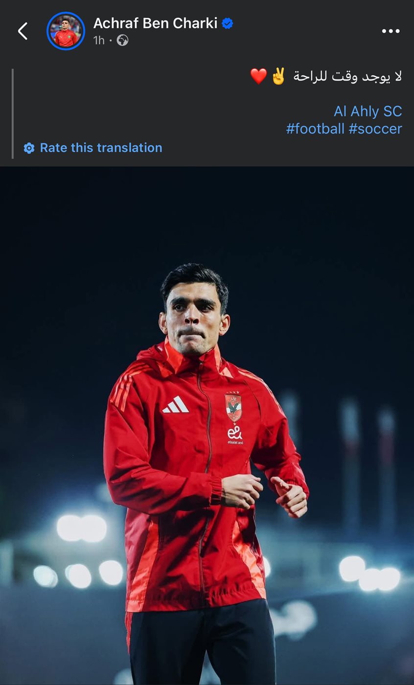 نشر أشرف بن شرقي، لاعب الفريق الأول لكرة القدم بالنادي الأهلي، أول تعليق له بعد اقترابه من العودة للمشاركة مع الفريق، عقب تعافيه من الإصابة التي أبعدته عن الملاعب خلال الفترة الماضية.