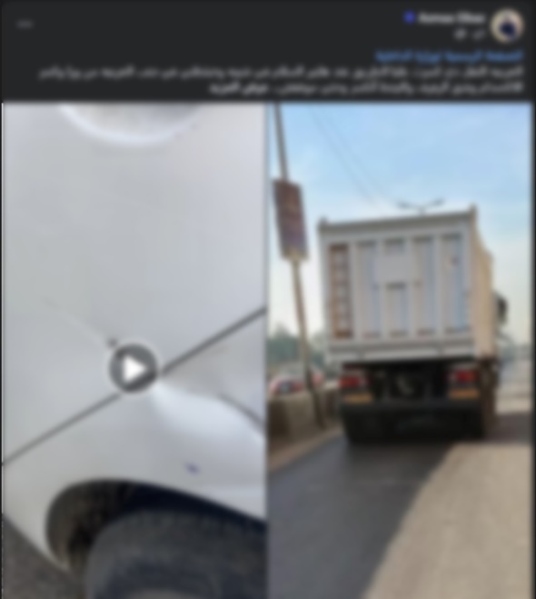 تمكنت الأجهزة الأمنية من كشف ملابسات منشور مدعوم بصورة يظهر تضرر قائمة على النشر من اصطدام سيارة نقل بسيارتها وإحداث تلفيات بها ولاذ قائدها بالفرار أثناء سيرها بمحافظة الشرقية.