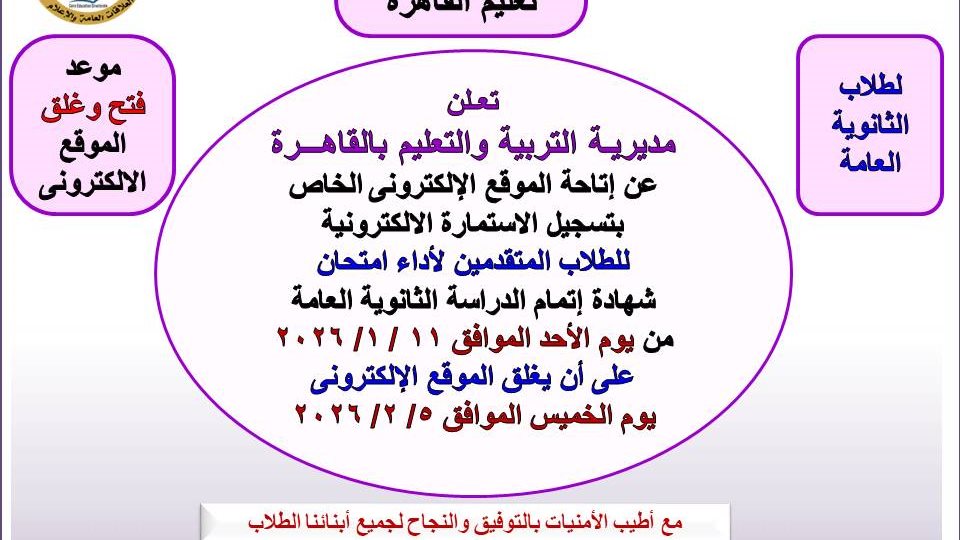 أعلنت همت إسماعيل أبو كليلة مدير مديرية التربية والتعليم بالقاهرة،عن إتاحة الموقع الإلكتروني الخاص بتسجيل الاستمارة الإلكترونية للطلاب المتقدمين لأداء امتحان شهادة إتمام الدراسة الثانوية العامة من يوم الأحد الموافق 11 يناير، على أن يغلق الموقع الإلكترونى يوم الخميس الموافق 5 فبراير.