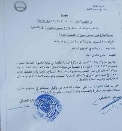 التفاصيل الكاملة لحفظ الأموال العامة بلاغ الرياضة ضد نادي الطيران الرياضي بتهمة إهدار المال العام "مستند"