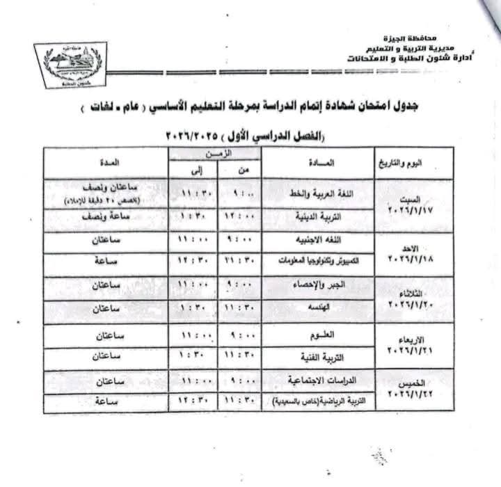 أعلنت مديرية التربية والتعليم بمحافظة الجيزة، من خلال إدارة شؤون الطلبة والامتحانات، جدول امتحانات شهادة إتمام الدراسة بمرحلة التعليم الأساسي (الشهادة الإعدادية – عام ولغات) للفصل الدراسي الأول للعام الدراسي 2025 / 2026.