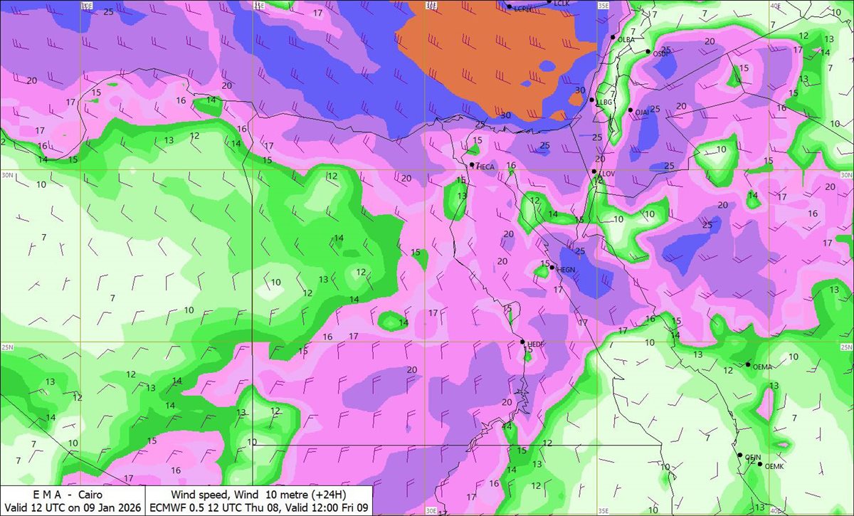 وحذرت الأرصاد أيضًا من نشاط ملحوظ للرياح على كافة الأنحاء، وتتراوح سرعتها بين 40 إلى 60 كم/س، وقد تكون مثيرة للرمال والأتربة على بعض المناطق.