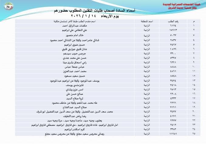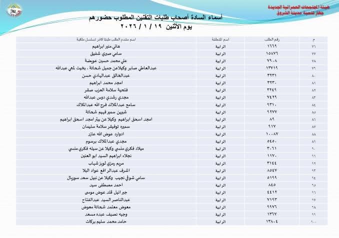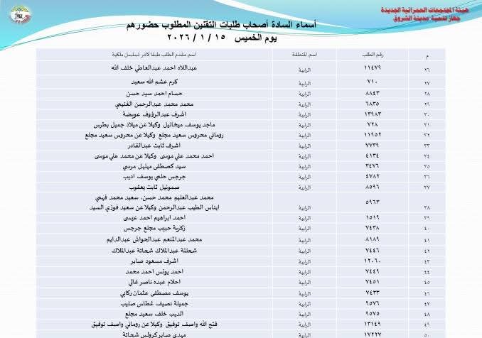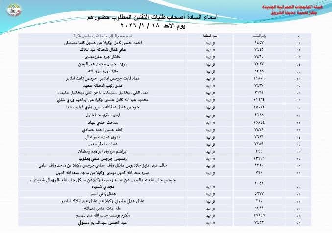 أعلنت هيئة المجتمعات العمرانية بوزارة الإسكان، عن أسماء دفعة جديدة من أصحاب طلبات تقنين أراضيهم بتوسعات مدينة الشروق، وطالبتهم بالحضور إلى مقر جهاز المدينة لاستكمال إجراءات التقنين، وذلك بداية من يوم الأحد المقبل 18 يناير الجاري.