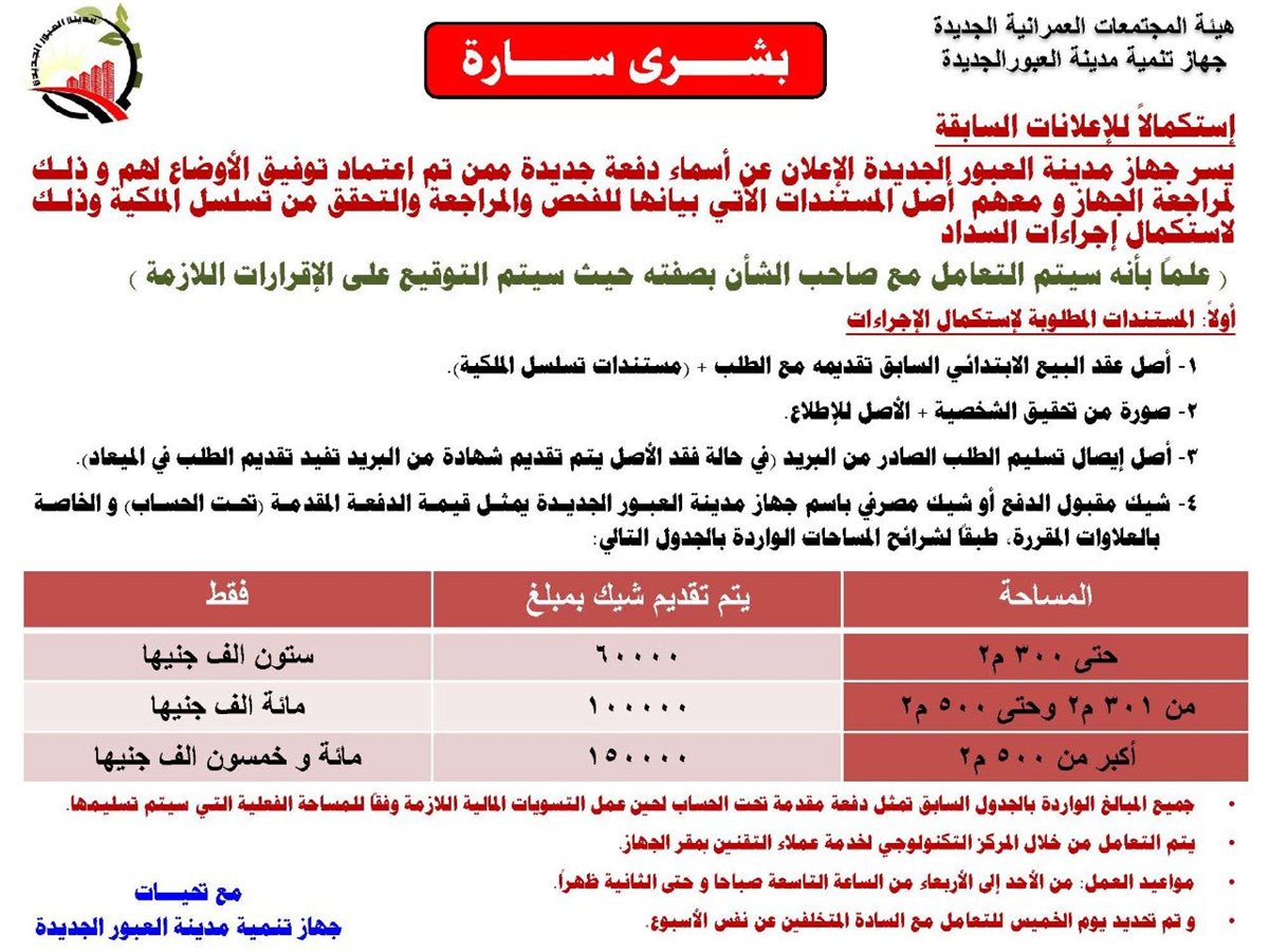 وناشد جهاز مدينة العبور الجديدة المواطنين بمراجعة الجهاز لاستكمال الإجراءات والسداد، علمًا بأنه سيتم التعامل مع صاحب الشأن بصفته، حيث سيتم التوقيع على الإقرارات اللازمة، وذلك بداية الأحد المقبل 15 يناير.