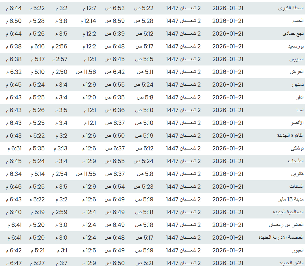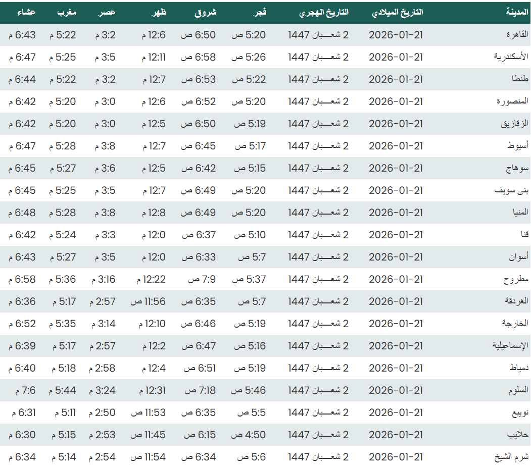 موعد أذان الفجر اليوم وفقًا للتوقيت المحلي لمدينتي القاهرة والإسكندرية وكذلك، مواقيت الصلاة، لعدد من مدن ومحافظات الجمهورية