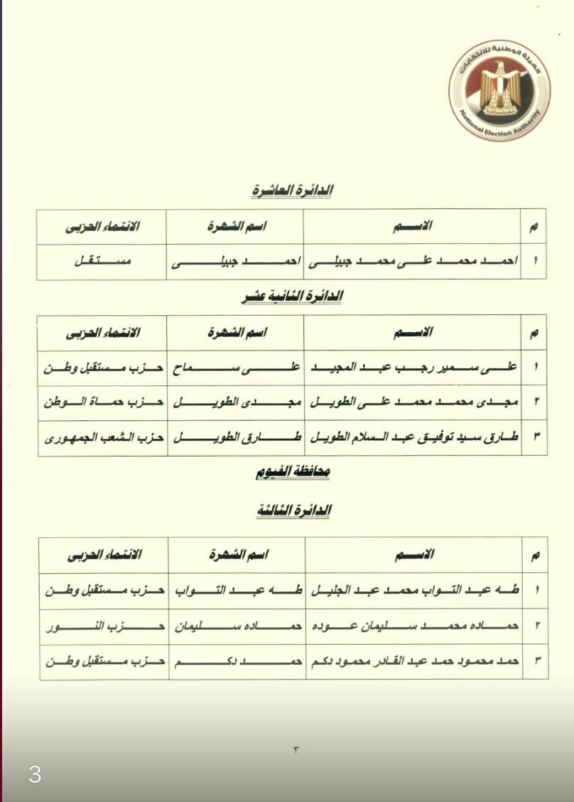 الدائرة الثالثة (مركز سنورس): فوز طه عبد التواب، وحمادة سليمان عودة، وحمد محمود.