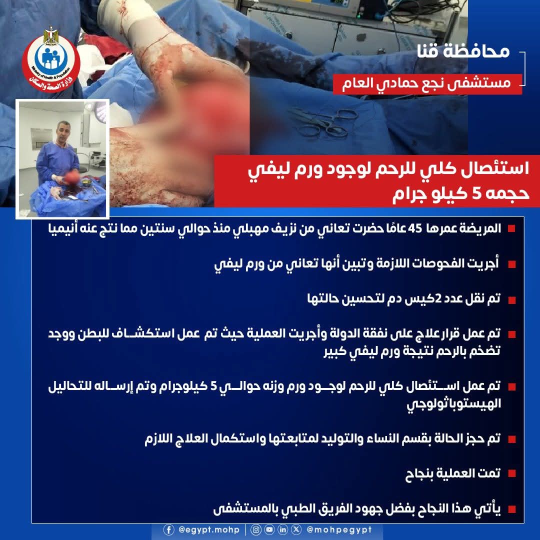الصحة: مستشفى نجع حمادي العام ينجح في استئصال أورام ليفية لسيدة بوزن 5 كيلو