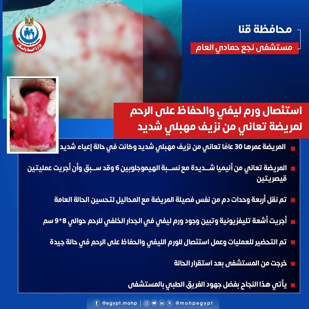 وتم تحضير المريضة وإجراء جراحة دقيقة لاستئصال الورم الليفي مع الحفاظ الكامل على الرحم، وهو ما يُعد إنجازًا طبيًا مهمًا نظرًا لصغر سن المريضة وإمكانية الحفاظ على فرصها الإنجابية مستقبلًا، وخرجت المريضة من المستشفى بعد استقرار حالتها وتحسن مؤشرات الدم.