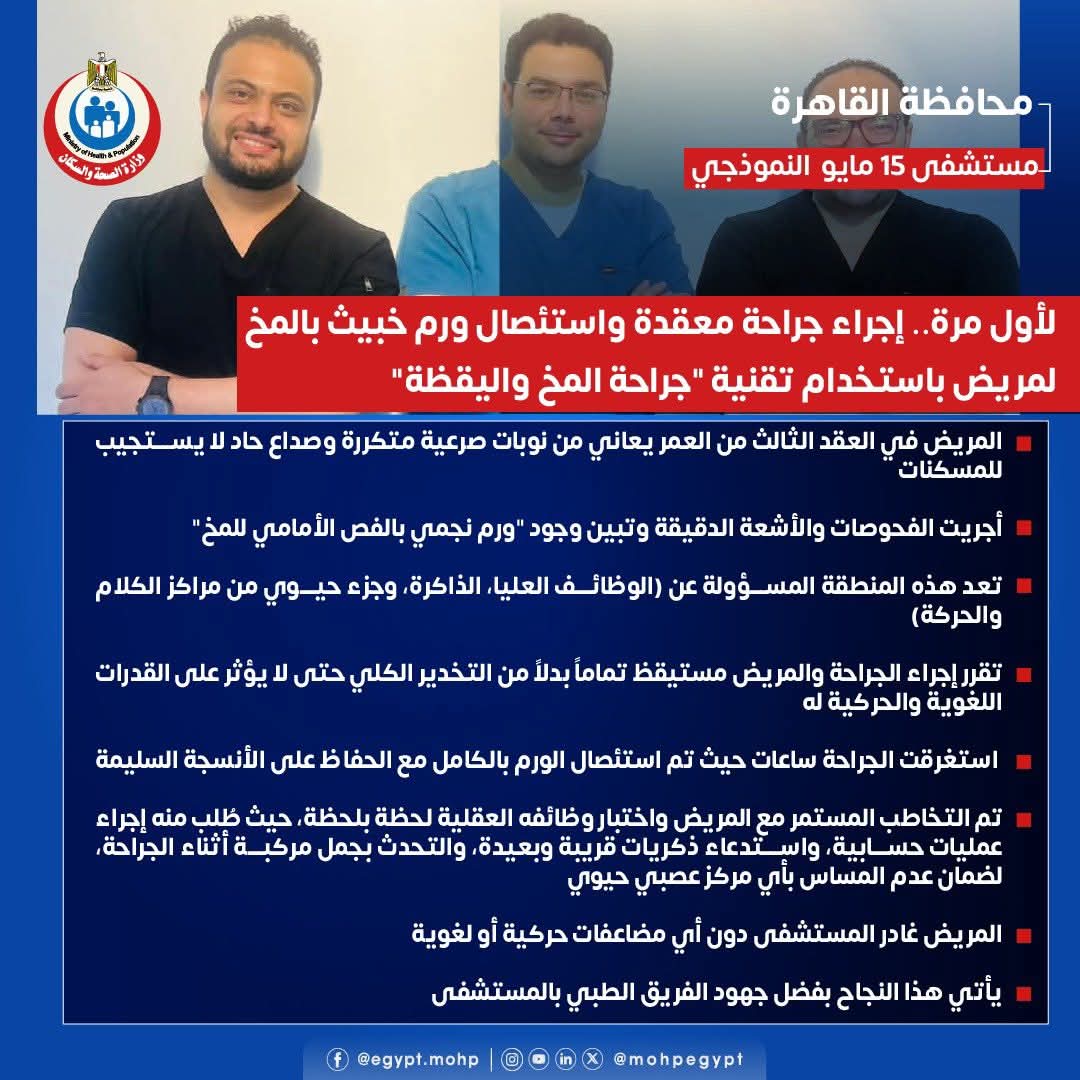 أعلنت وزارة الصحة عن نجاح الفريق الطبي بمستشفى 15 مايو النموذجي في إجراء جراحة معقدة وفريدة من نوعها لأول مرة بالمستشفى، تم خلالها استئصال ورم خبيث بالمخ لمريض باستخدام تقنية "جراحة المخ واليقظة".