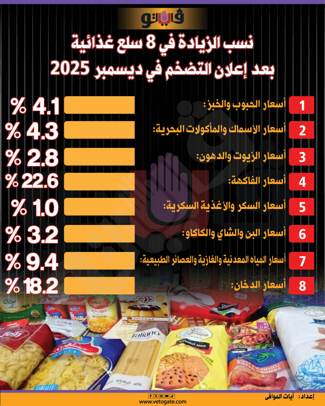 نسب الزيادة في 8 سلع غذائية بعد إعلان التضخم في ديسمبر 2025 (إنفوجراف)