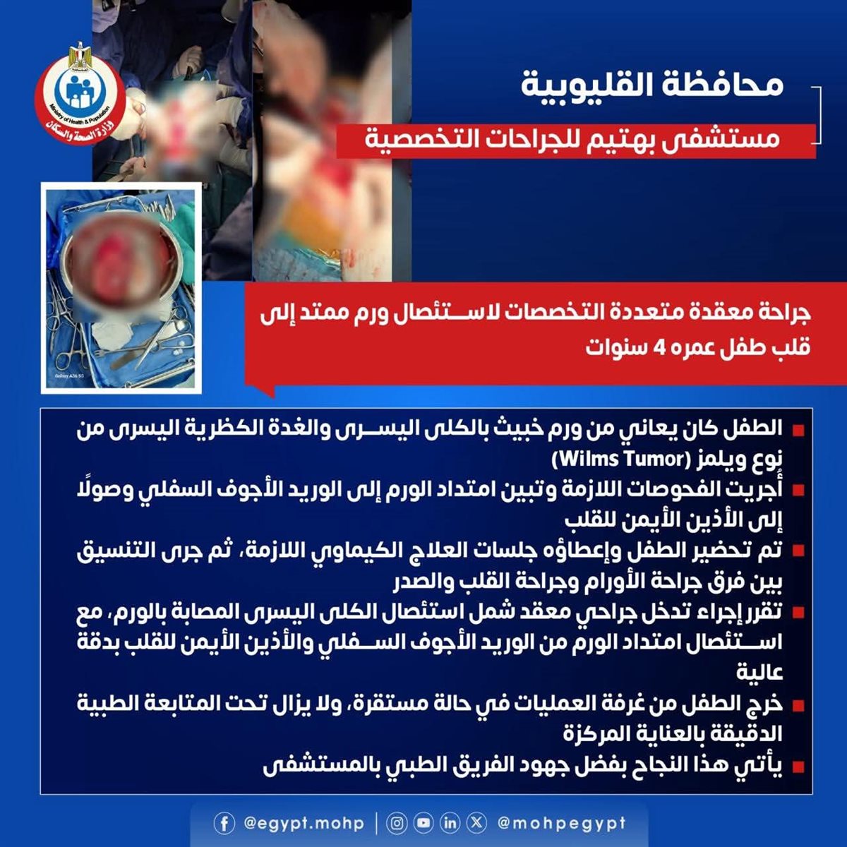 أعلنت وزارة الصحة والسكان عن نجاح فريق طبي بمستشفى بهتيم للجراحات التخصصية بمحافظة القليوبية في إجراء جراحة معقدة لطفل عمره 4 سنوات، كان يعاني من ورم خبيث بالكلية اليسرى والغدة الكظرية اليسرى من نوع "ويلمز" (Wilms Tumor).
