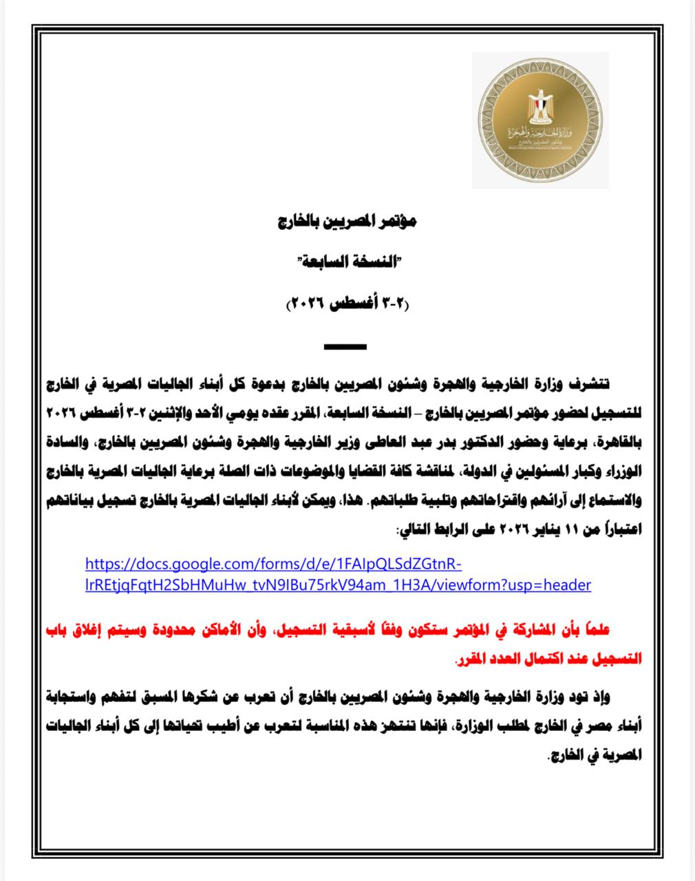تقدمت وزارة الخارجية والهجرة وشئون المصريين بالخارج بدعوة كل أبناء الجاليات المصرية في الخارج للتسجيل لحضور مؤتمر المصريين بالخارج - النسخة السابعة المقرر عقده يومي الأحد والإثنين 2-3 أغسطس 2026 بالقاهرة، برعاية وحضور الدكتور بدر عبد العاطى وزير الخارجية والهجرة وشئون المصريين بالخارج، والوزراء وكبار المسئولين في الدولة.