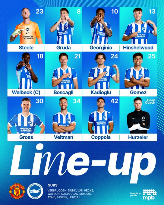وأعلن برايتون عن تشكيل فريقه أمام مانشستر يونايتد والذي جاء كالتالي: