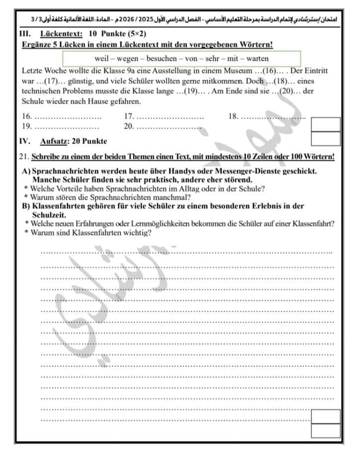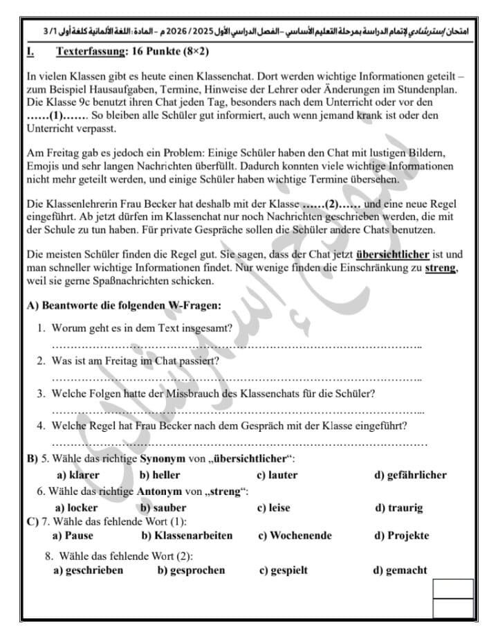 نشرت مديرية التربية والتعليم بالقاهرة النماذج الاسترشادية بنظام البوكليت في مادة اللغة الألمانية كلغة أولى، وذلك في إطار الاستعداد لامتحانات الفصل الدراسي الأول للعام الدراسي ٢٠٢٥ / ٢٠٢٦ لطلاب الشهادة الإعدادية.