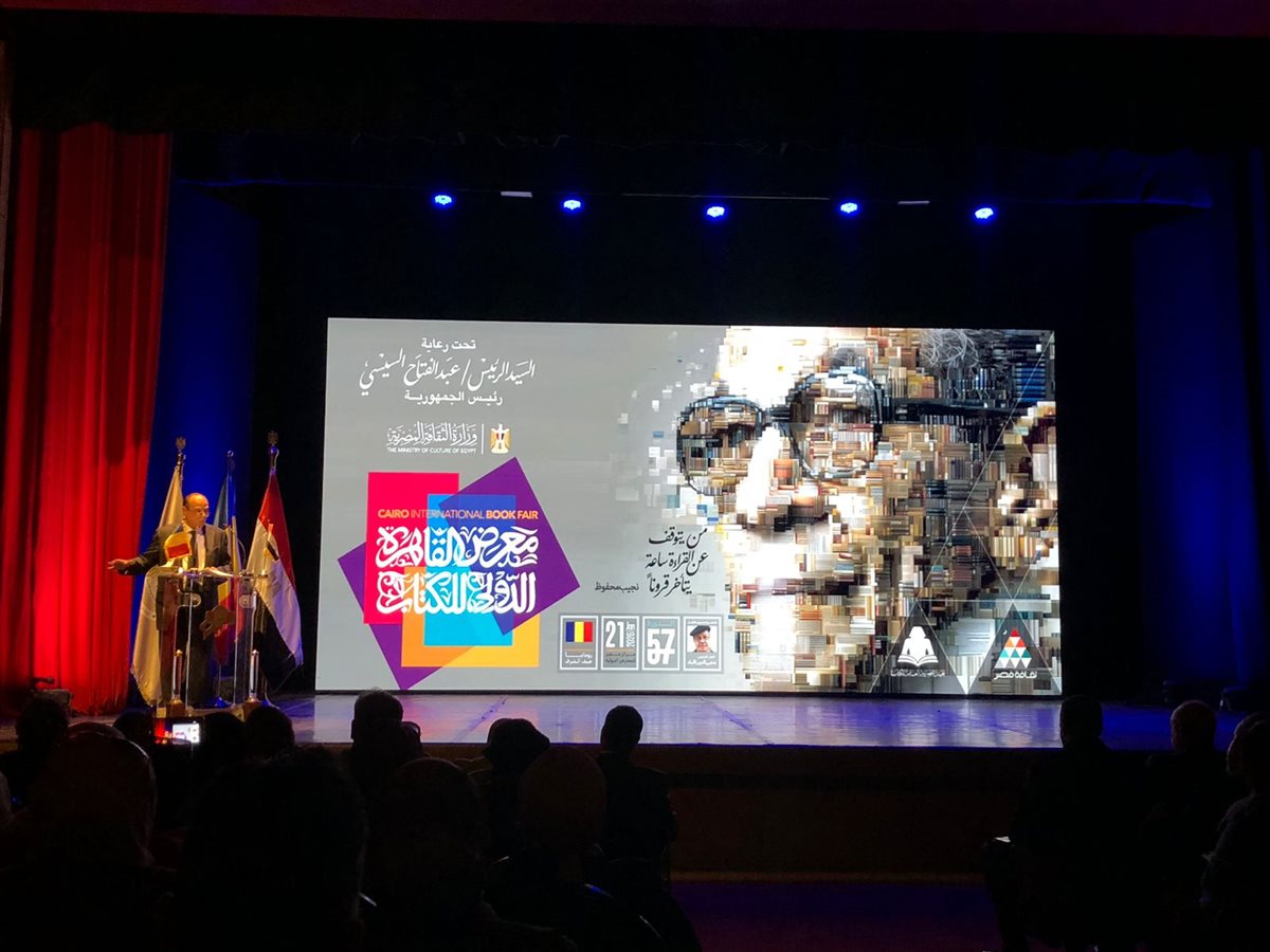 مقولته الشهيرة "من يتوقف عن القراءة ساعة يتأخر قرونًا" شعارًا للدورة 57، مشيرا إلى أنه بخلاف الندوات سيتم إطلاق معرض "نجيب محفوظ بعيون العالم" الذي يضم 40 لوحة لفنانين كاريكاتير عالميين.