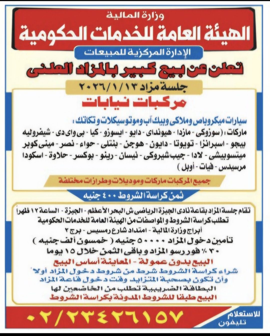 أعلنت وزارة المالية، ممثلة في الهيئة العامة للخدمات الحكومية – الإدارة المركزية للمبيعات، عن تنظيم بيع كبير بالمزاد العلني لعدد من مركبات النيابات، وذلك خلال جلسة المزاد المقرر عقدها يوم الثلاثاء 13 يناير 2026.