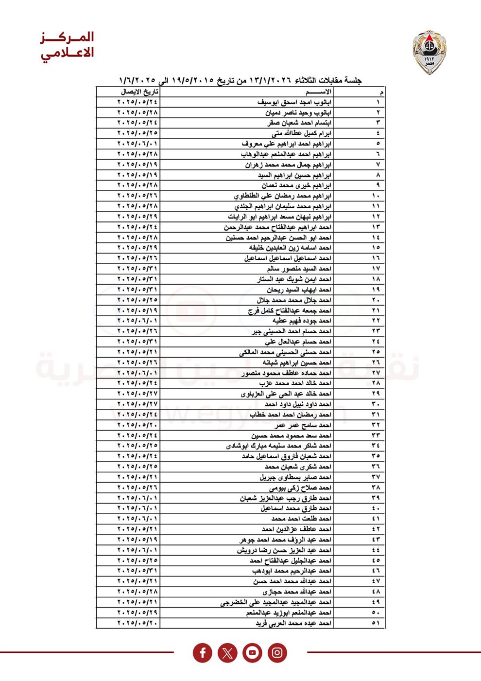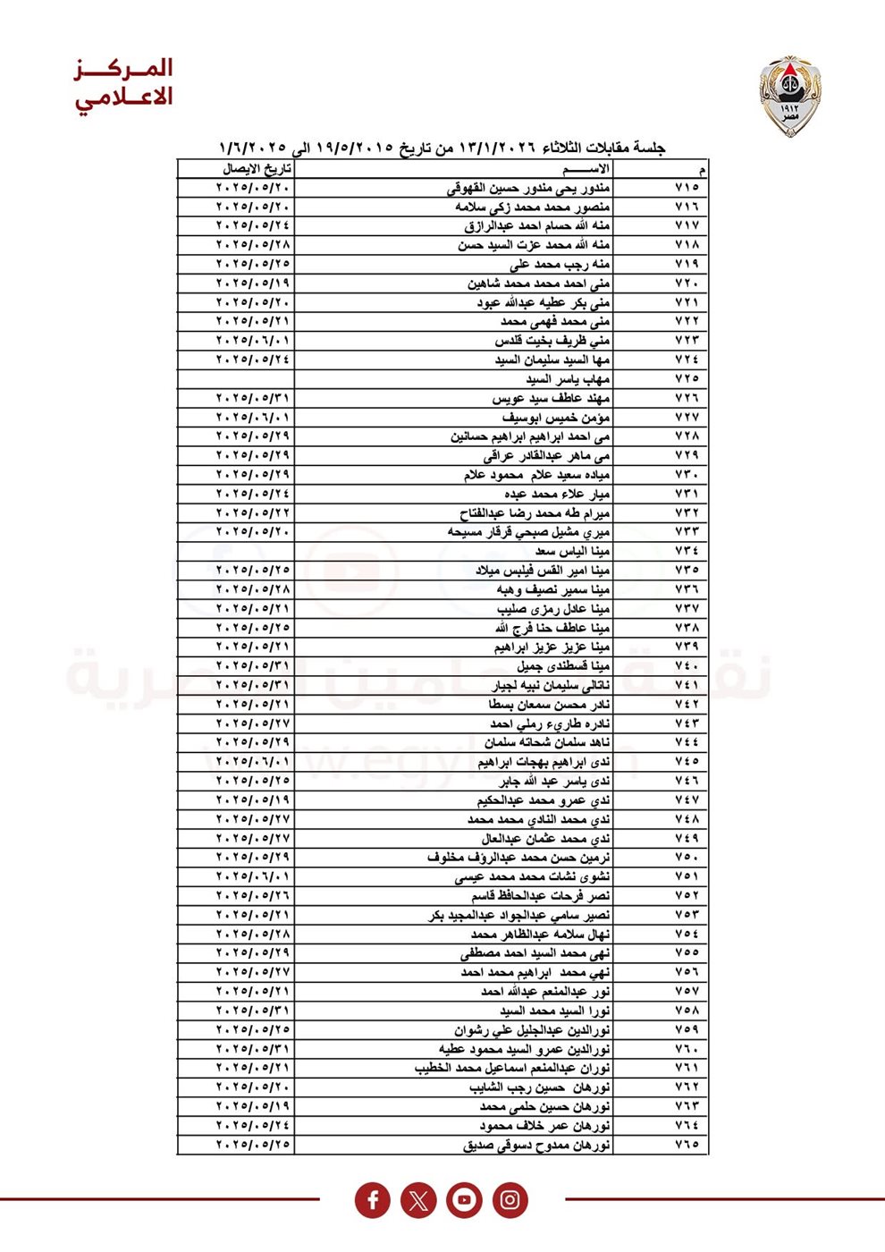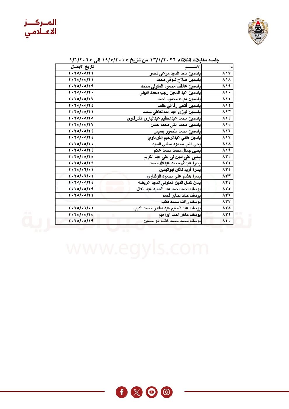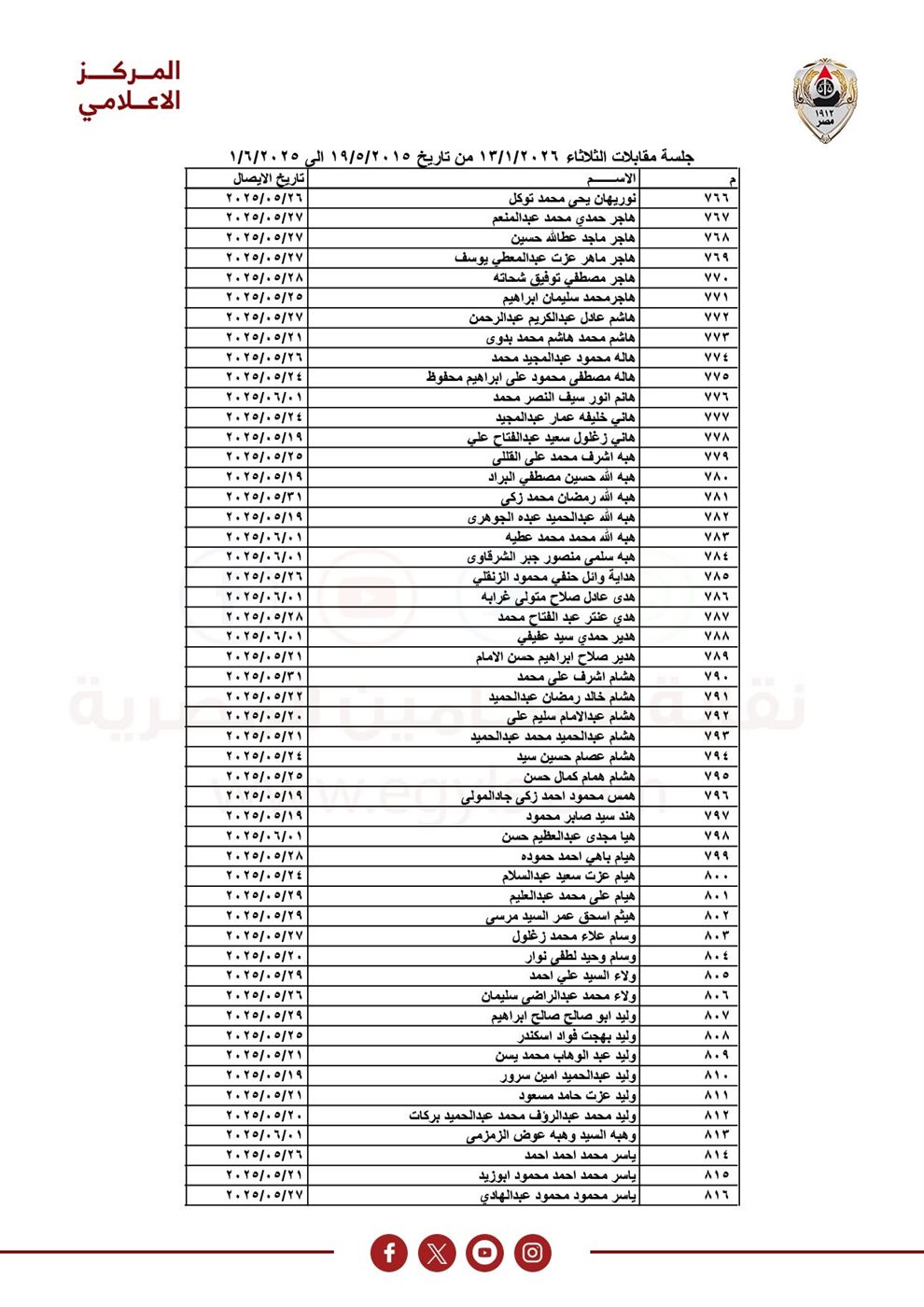 أعلنت نقابة المحامين، أسماء المحامين، الذي سيخضعون للمقابلات الشخصية، غدًا الثلاثاء، تمهيدًا لقيدهم بالجدول العام بالنقابة، الذي يبلغ عددهم ٨٤٠ محاميًا.