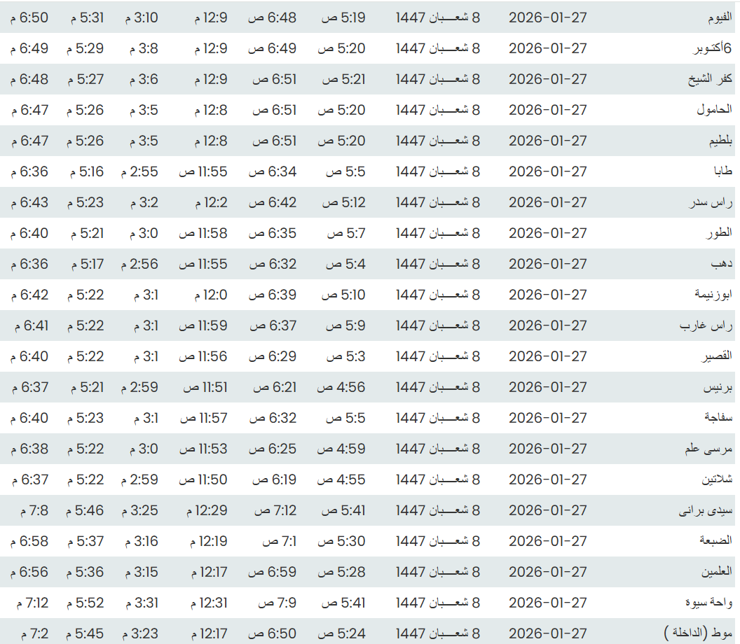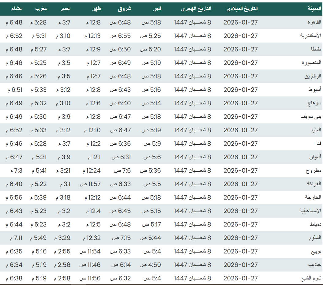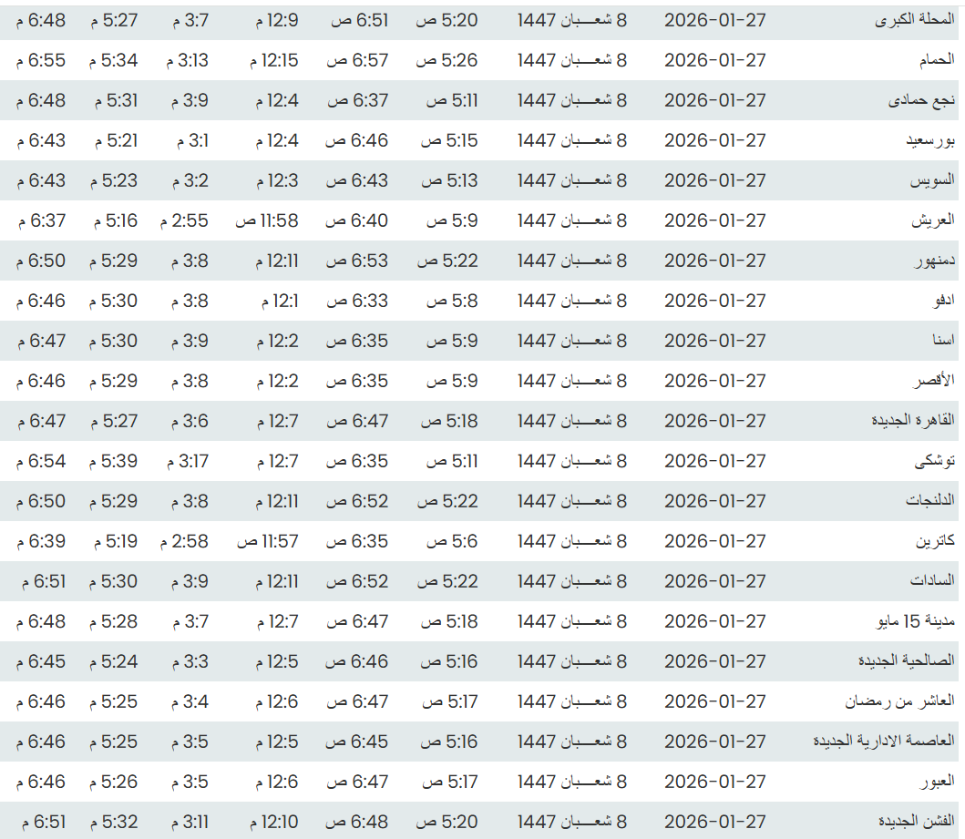 وفيما يلي مواقيت الصلاة، لعدد من مدن ومحافظات الجمهورية من واقع بيانات الهيئة العامة للمساحة