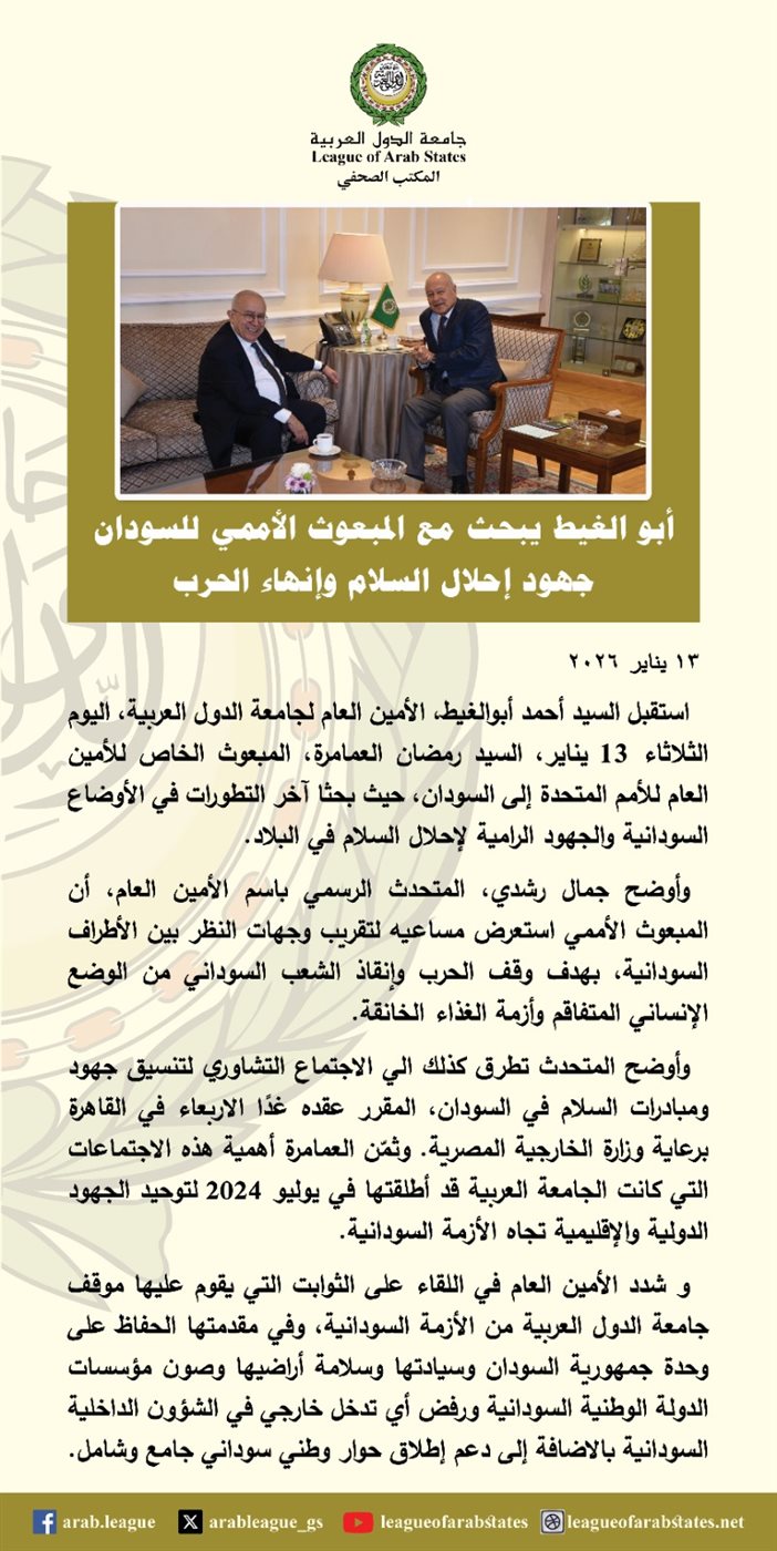 وشدد الأمين العام في اللقاء على الثوابت التي يقوم عليها موقف جامعة الدول العربية من الأزمة السودانية، وفي مقدمتها الحفاظ على وحدة جمهورية السودان وسيادتها وسلامة أراضيها وصون مؤسسات الدولة الوطنية السودانية ورفض أي تدخل خارجي في الشؤون الداخلية السودانية بالاضافة إلى دعم إطلاق حوار وطني سوداني جامع وشامل.