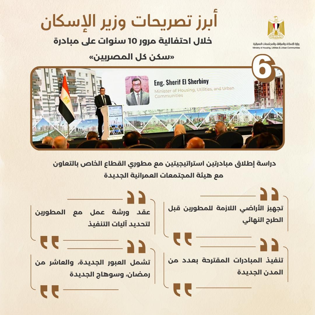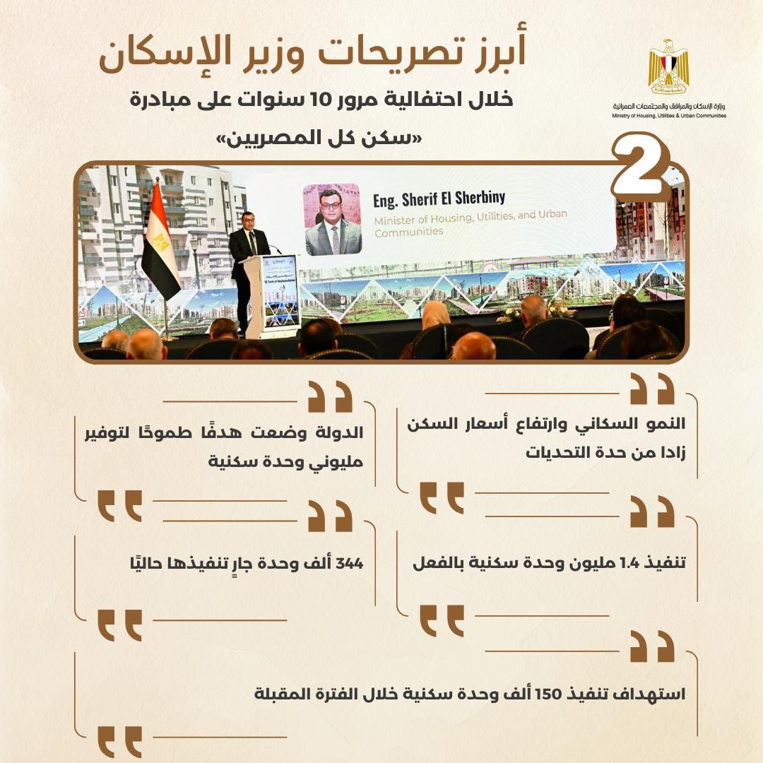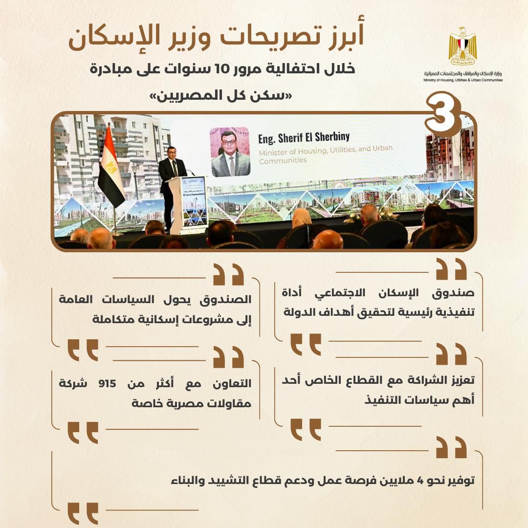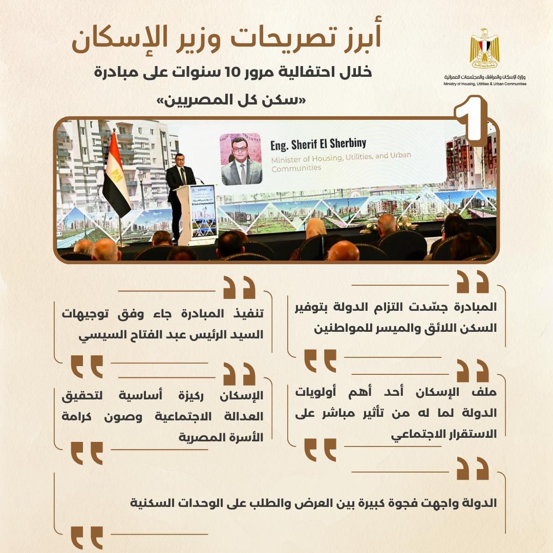 ألقى المهندس شريف الشربيني، وزير الإسكان والمرافق والمجتمعات العمرانية، كلمة، خلال الاحتفالية التي شهدها الدكتور مصطفى مدبولي، رئيس مجلس الوزراء، اليوم، للاحتفاء بإنجازات 10 سنوات على المبادرة الرئاسية "سكن كل المصريين".