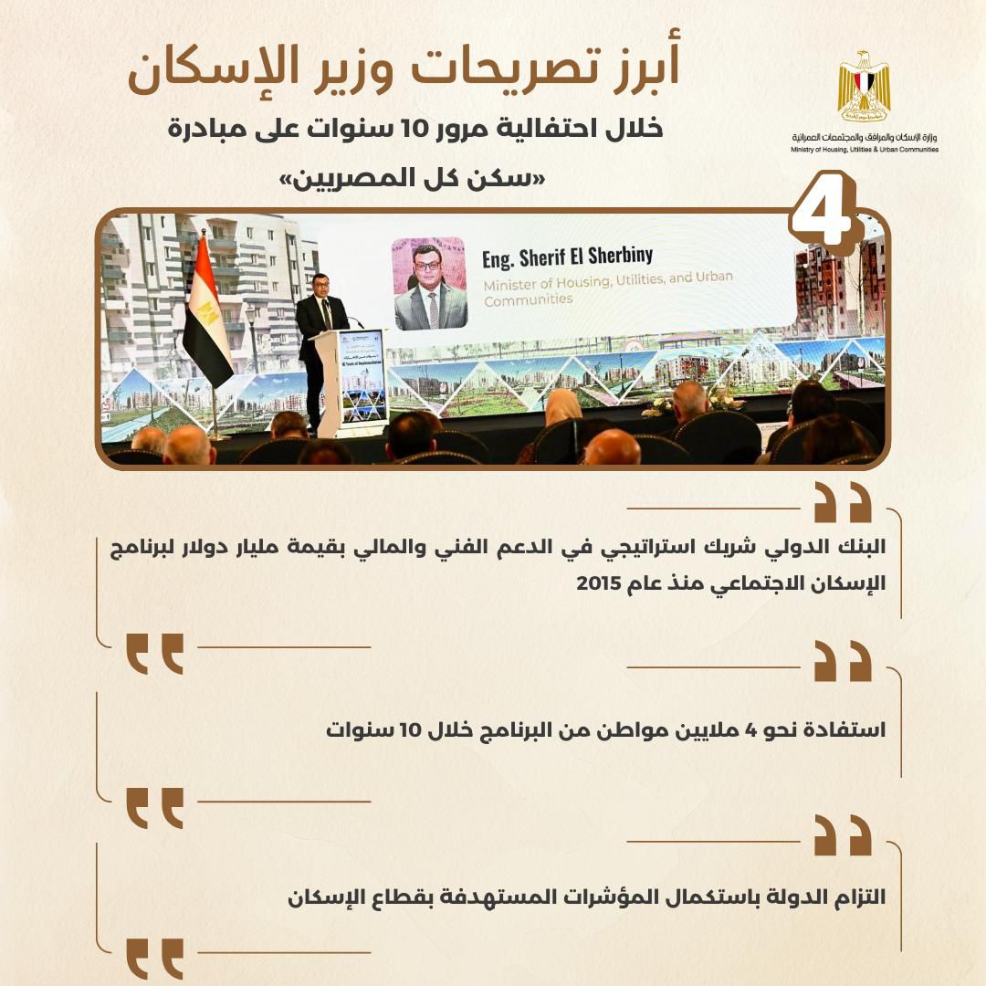وأوضح وزير الإسكان والمرافق والمجتمعات العمرانية أن الشريك الأول للدولة في هذا البرنامج كان البنك الدولي، والذي كان له دورٌ محوري كشريك استراتيجي في الدعم الفني والمالي بقيمة مليار دولار لبرنامج الإسكان الاجتماعي، حيث ساهم منذ عام 2015 في مساعدة الأسر المصرية على امتلاك مسكن واستئجاره ليصل عدد المستفيدين من البرنامج إلى حوالي 4 ملايين مواطن على مدار 10 سنوات، مما أسهم في تعزيز كفاءة الأداء المؤسسي، بما دعم استدامة البرنامج وعزز ثقة الشركاء الدوليين في التجربة المصرية.