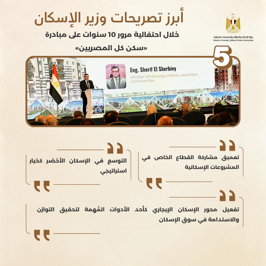 وقال الوزير: "نؤكد التزامنا الكامل باستكمال باقي المُؤشرات المُستهدفة، وعلى رأسها تعميق مُشاركة القطاع الخاص، والتوسع في الإسكان الأخضر، وتفعيل محور الإسكان الإيجاري، كأحد الأدوات المُهمة لتحقيق التوازن والاستدامة في سوق الإسكان".