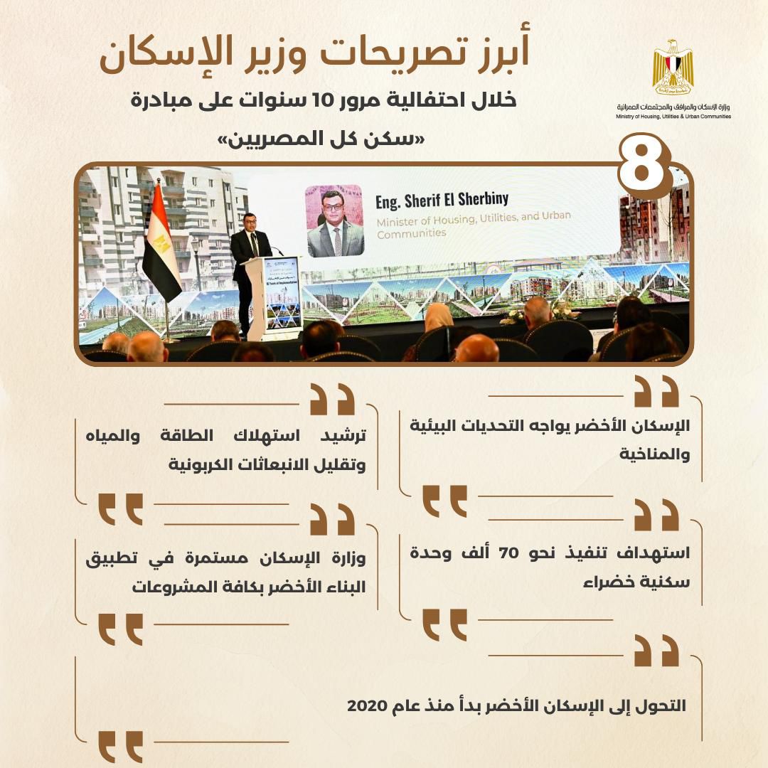 وفي ختام كلمته، أكد المهندس شريف الشربيني أن وزارة الإسكان، ماضية في تنفيذ استراتيجية الإسكان والبناء الأخضر في كل مشروعات الإسكان الحالية والمستقبلية، بالتعاون مع مُختلف أجهزة الدولة، وستواصل العمل على استكمال هذا المسار الوطني، وتوسيع برامج الإسكان بما يلبي احتياجات المواطنين، ويُجسد التزام الدولة الراسخ بتوفير حياة كريمة وآمنة لكل مواطن مصري.