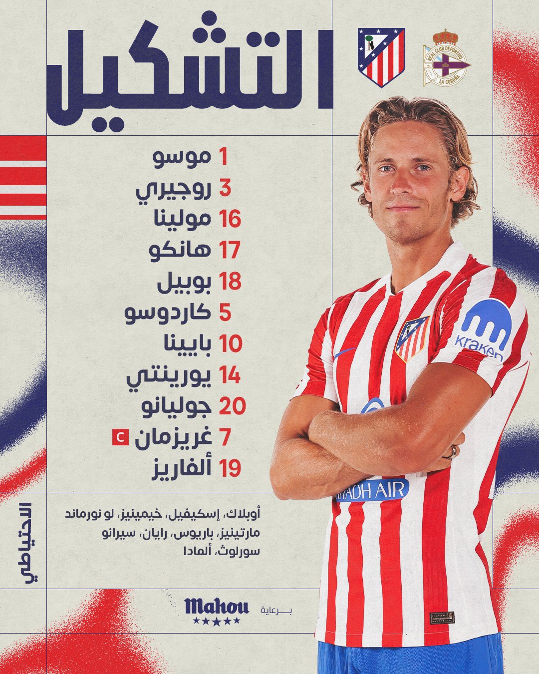 دخل فريق أتلتيكو مدريد مباراته أمام ديبورتيفو لاكورنيا في كأس ملك اسبانيا بتشكيل مكون من: