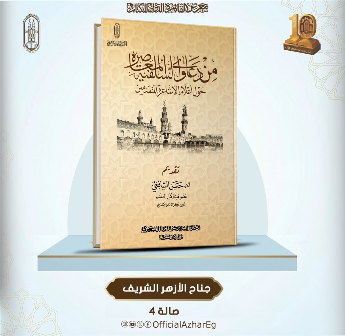 يقدِّم جناح الأزهر الشريف بمعرض القاهرة الدولي للكتاب، في دورته الـ 57، لزوَّاره كتاب "من دعاوي السلفيَّة المعاصرة حول أعلام الأشاعرة المتقدِّمين"، من إصدارات مركز الإمام الأشعري بالأزهر الشَّريف، يتناول حقيقة دعوى المرحلة الثالثة للإمام الأشعري (ت: 324هـ) وتفنيدها؛ من خلال تراث تلميذه ابن خفيف الشيرازي (ت: 371هـ)، ودعوى عدم أشعريَّة الحافظ أبي بكر الإسماعيلي (ت: 371هـ) وتفنيدها.