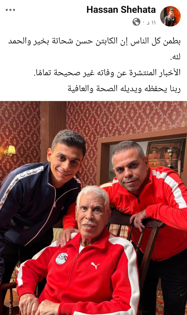 وكتب حفيد المعلم عبر صفحته علي فيس بوك:"بطمن كل الناس إن الكابتن حسن شحاتة بخير والحمد لله. الأخبار المنتشرة عن وفاته غير صحيحة تمامًا.ربنا يحفظه ويديله الصحة والعافية".