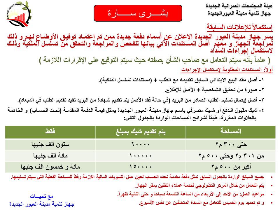 وناشد جهاز مدينة العبور الجديدة المواطنين بمراجعة الجهاز لاستكمال الإجراءات والسداد، علمًا بأنه سيتم التعامل مع صاحب الشأن بصفته، حيث سيتم التوقيع على الإقرارات اللازمة، وذلك بداية 19 أبريل المقبل.