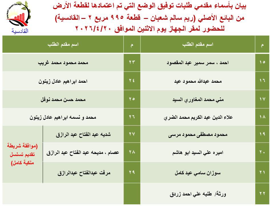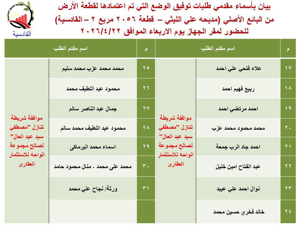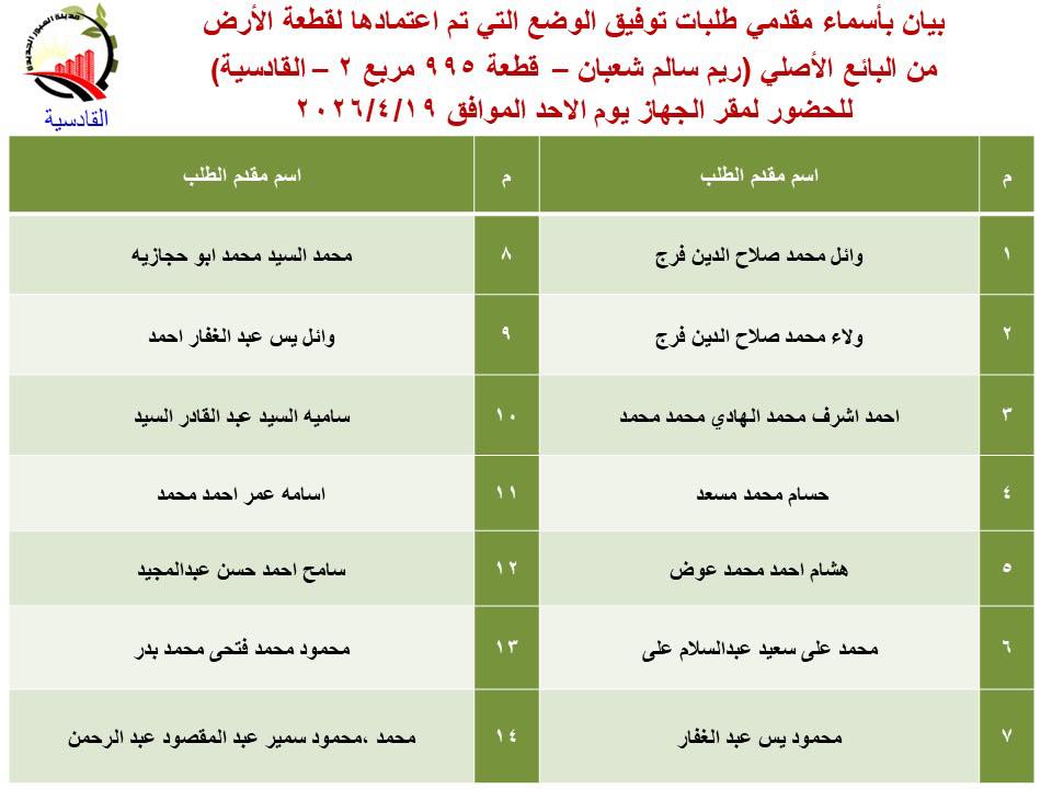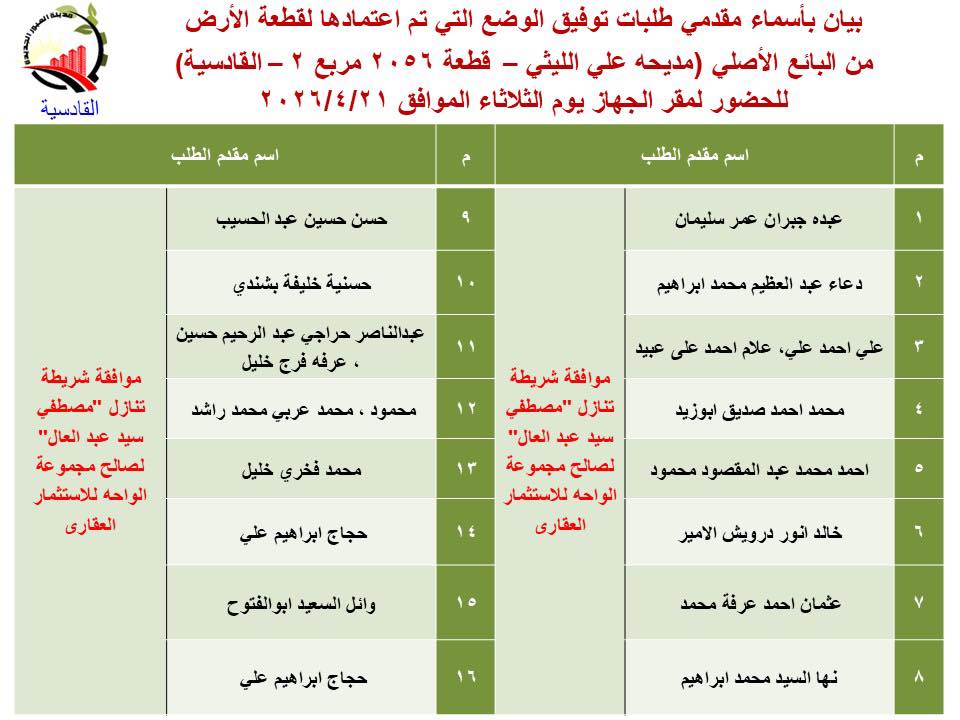 بالأسماء، تقنين قطع أراضي بمنطقة القادسية بمدينة العبور الجديدة