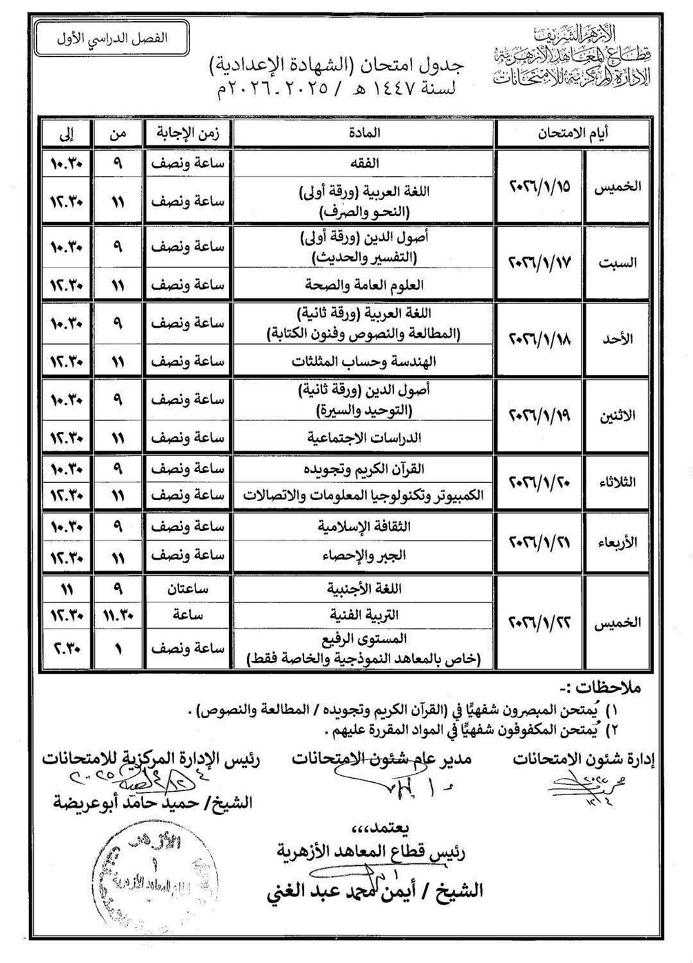 تنطلق اليوم الخميس امتحانات الفصل الدراسي الأول للعام الدراسي 2026/2025، لطلاب الصف السادس الابتدائي، وطلاب الشهادة الإعدادية، بالإضافة إلى طلاب البرنامج التأهيلي الملحقين بالشهادة الإعدادية، في المعاهد الأزهرية، وسط تعليمات مشددة من رئاسة قطاع المعاهد الأزهرية بضرورة توفير أجواء الراحة كافة للطلاب.