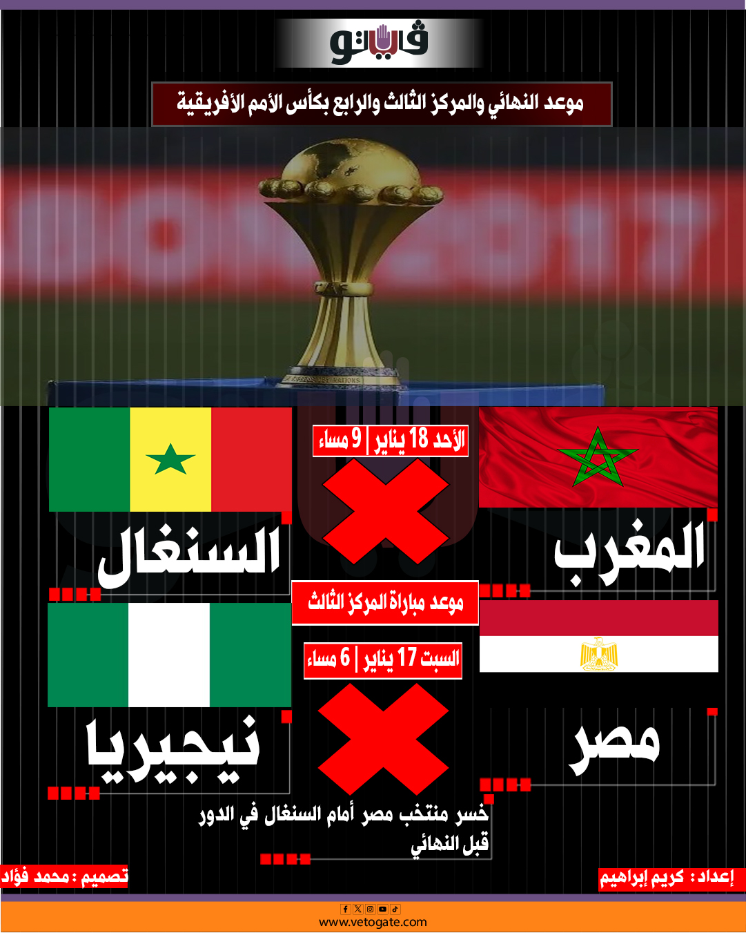 موعد النهائي والمركز الثالث والرابع بكأس الأمم الأفريقية (إنفوجراف)