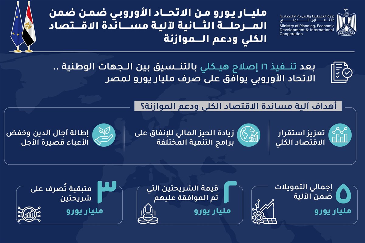 ويُعد هذا التمويل جزءًا من الحزمة التي تم التوقيع عليها في شهر أكتوبر الماضي، خلال القمة المصرية الأوروبية الأولى ببروكسل، والتي ينبثق عنها مذكرة التفاهم الخاصة بالمرحلة الثانية من آلية مساندة الاقتصاد الكلي ودعم الموازنة لجمهورية مصر العربية من الاتحاد الأوروبي.