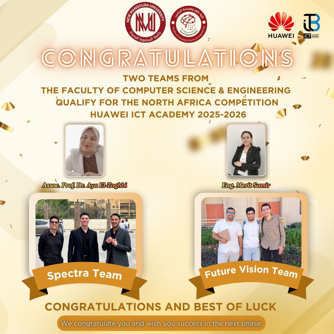 حققت كلية علوم وهندسة الحاسب بجامعة المنصورة الجديدة إنجازًا أكاديميًا متميزًا، بتأهل فريقين من طلاب الكلية للمنافسة على مستوى شمال أفريقيا ضمن مسابقة Huawei ICT Academy 2025–2026، وذلك لأول مرة في تاريخ الجامعة والكلية بأن يتأهل فريقان معًا في هذه المسابقة الدولية المرموقة.