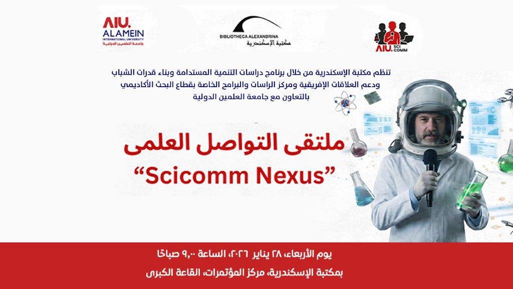 تنظم مكتبة الإسكندرية من خلال برنامج دراسات التنمية المستدامة وبناء قدرات الشباب ودعم العلاقات الأفريقية ومركز الدراسات الخاصة والبرامج بقطاع البحث الأكاديمي، بالتعاون مع جامعة العلمين الدولية ملتقى التواصل العلمي “SciComm Nexus”، وذلك يوم الأربعاء الموافق 28 يناير 2026 في تمام الساعة التاسعة صباحًا بالقاعة الكبرى، بمركز المؤتمرات.