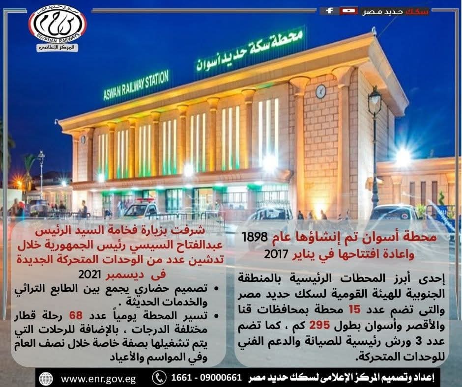 نشرت الهيئة القومية للسكك الحديدية تقريرا عن محطة قطارات أسوان، والتي تعد أحد ملامح التطوير والتحديث في منظومة السكك الحديدية المصرية.