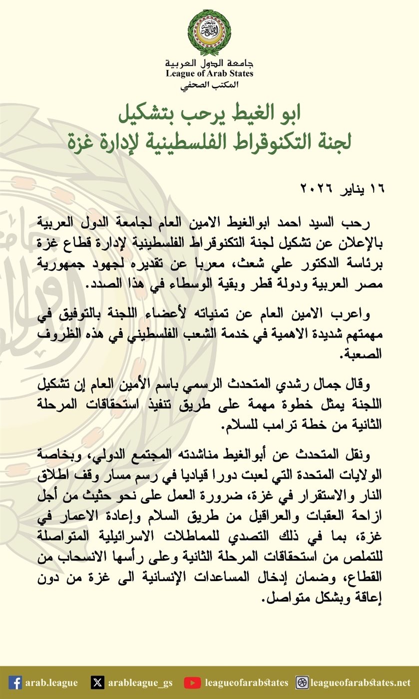 رحب أحمد أبو الغيط، الأمين العام لجامعة الدول العربية، بالإعلان عن تشكيل لجنة التكنوقراط الفلسطينية لإدارة قطاع غزة، برئاسة الدكتور علي شعث، معربًا عن تقديره للجهود التي تبذلها جمهورية مصر العربية ودولة قطر، إلى جانب بقية الوسطاء، في هذا الشأن.