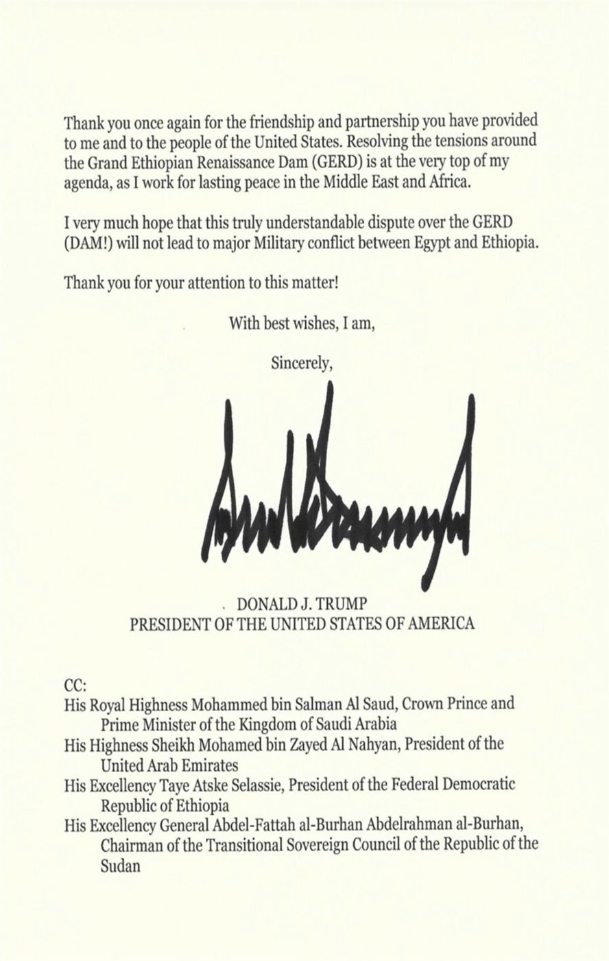وكتب ترامب في رسالته إلى السيسي، انطلاقًا من روح صداقتنا الشخصية والتزام أمريكا بالسلام ورفاهية الشعب المصري، فأنا على استعداد لاستئناف الوساطة الأمريكية بين مصر وإثيوبيا لحل مسألة "تقاسم مياه النيل" بشكل مسؤول ونهائي.