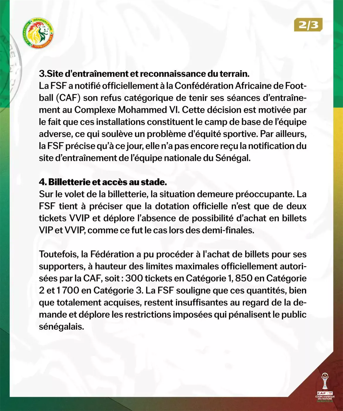 وفي إطار الشفافية والدفاع عن مصالح المنتخب الوطني السنغالي، يعرب الاتحاد عن أسفه لغيابٍ واضح للإجراءات الأمنية المناسبة عند وصول بعثة السنغال إلى محطة القطار بالرباط، وهو ما عرَّض اللاعبين والجهاز الفني للازدحام ومخاطر لا تليق بمعايير مباراة نهائية قارية.