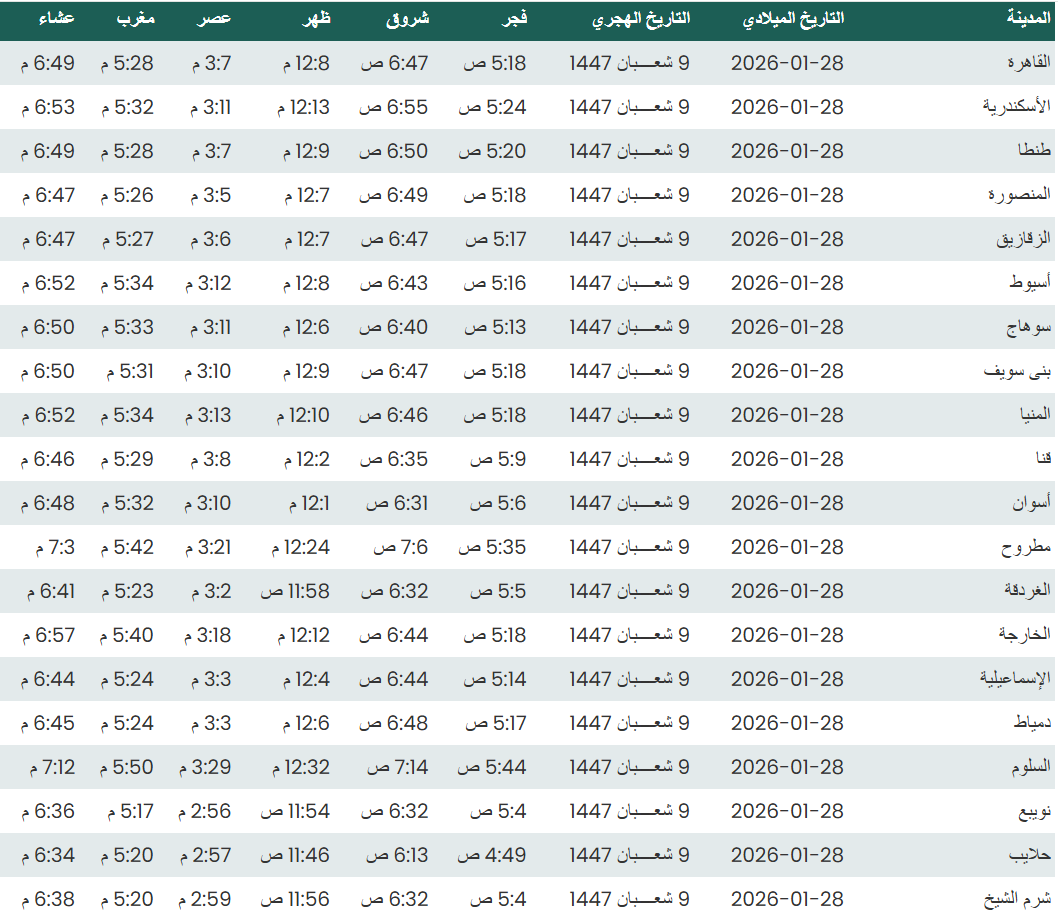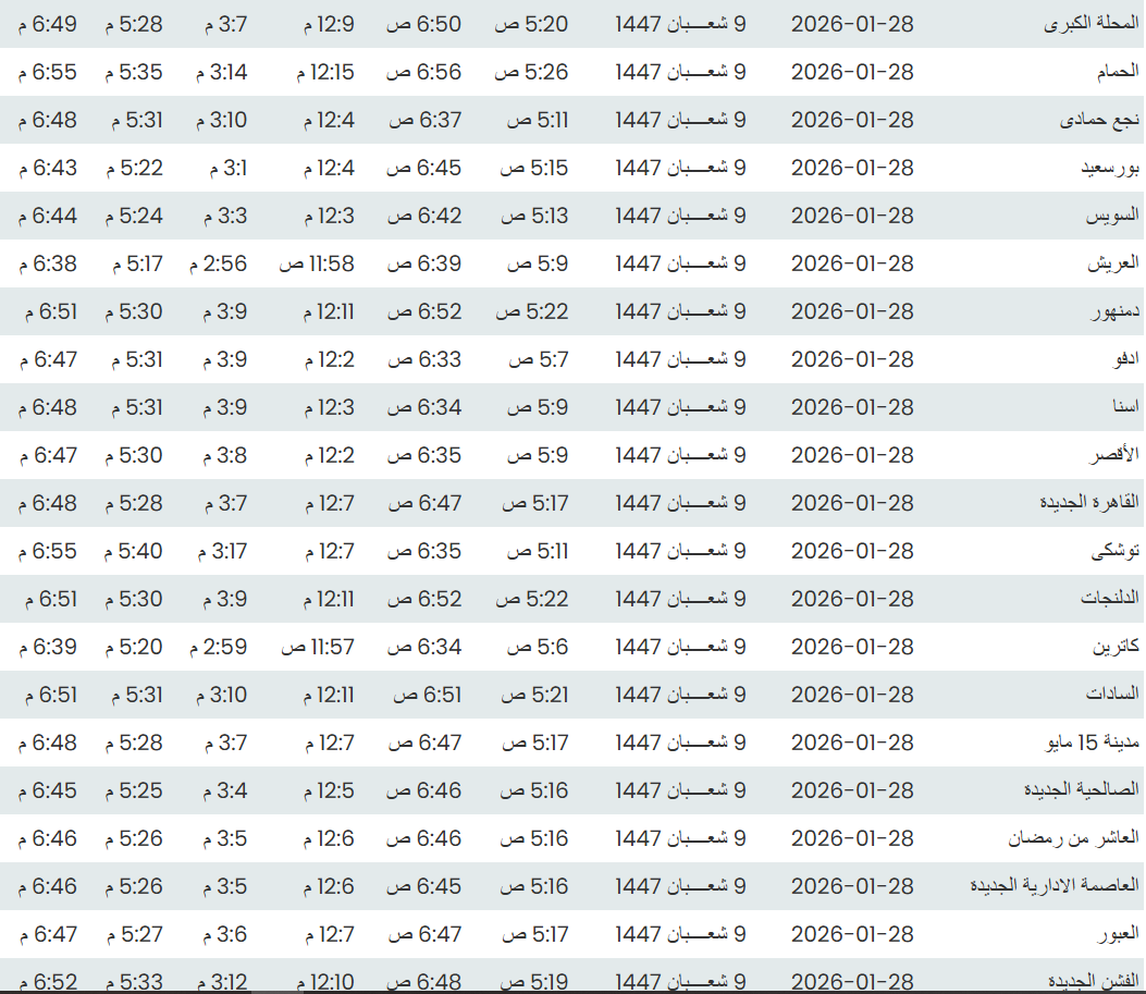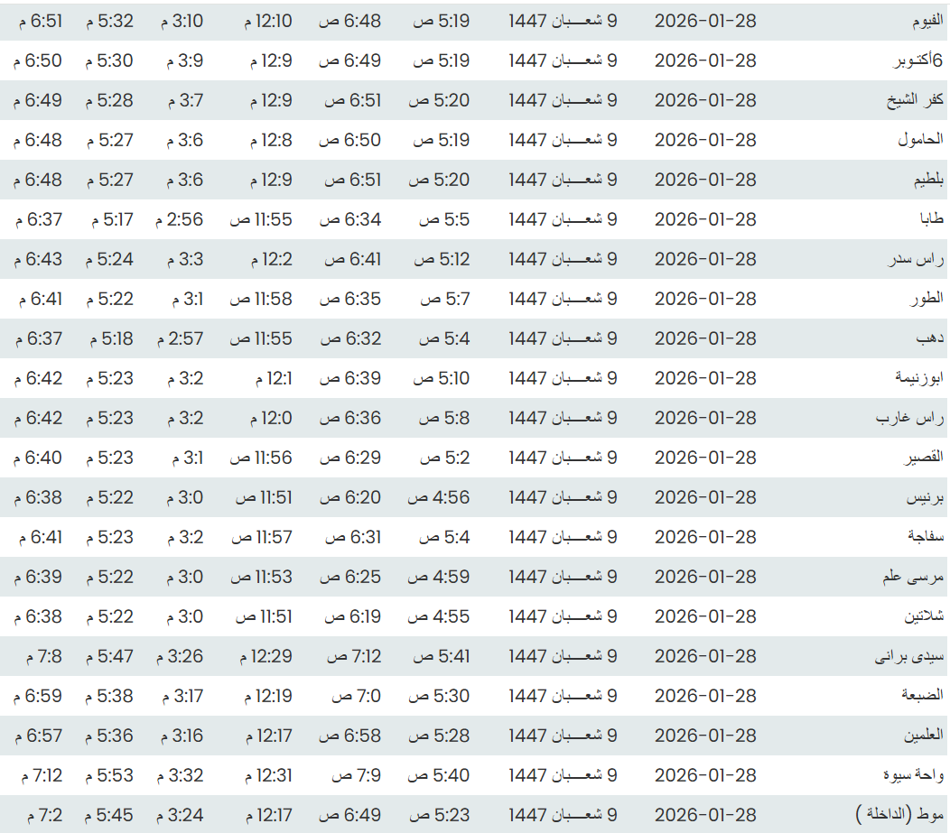 وفيما يلي مواقيت الصلاة، لعدد من مدن ومحافظات الجمهورية من واقع بيانات الهيئة العامة للمساحة