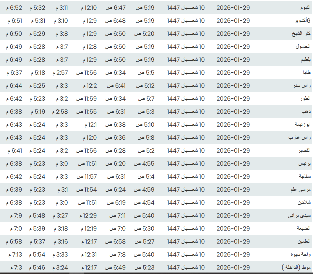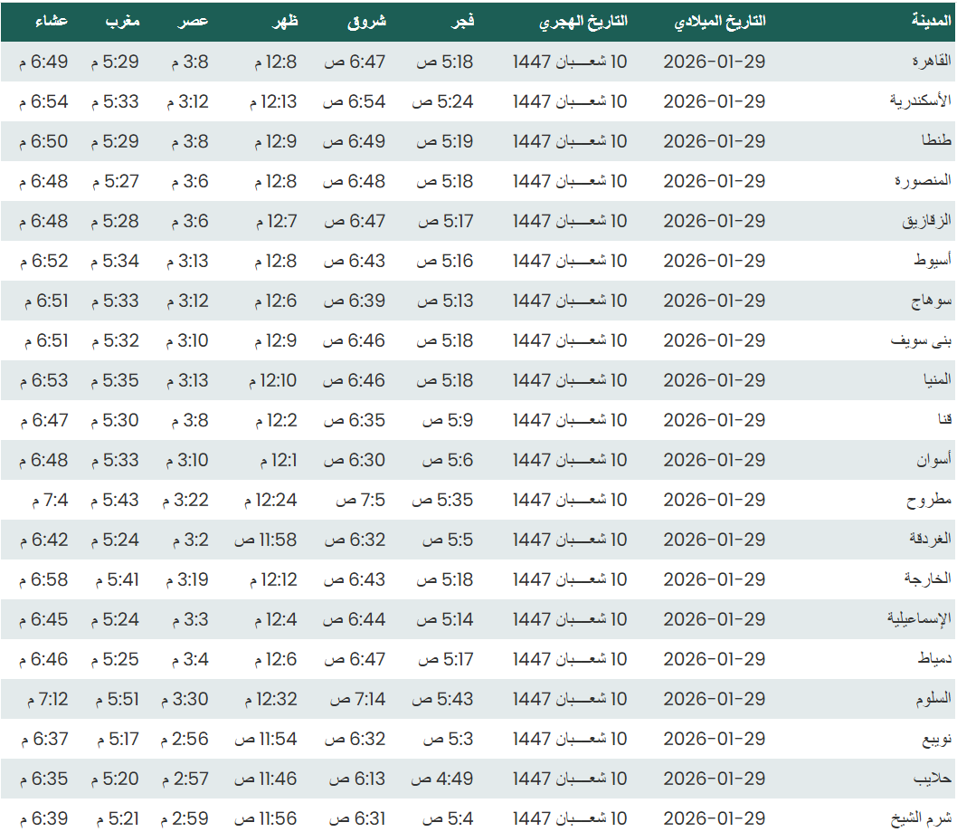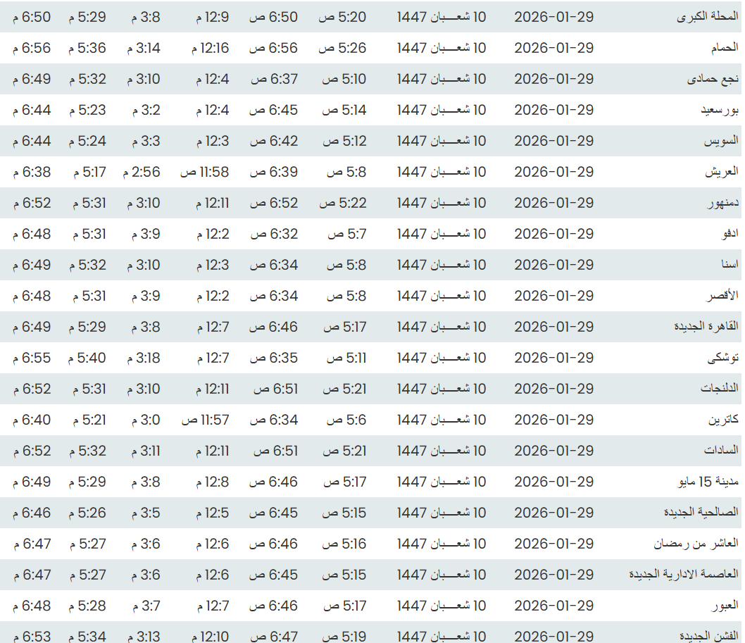 وفيما يلي مواقيت الصلاة، لعدد من مدن ومحافظات الجمهورية من واقع بيانات الهيئة العامة للمساحة