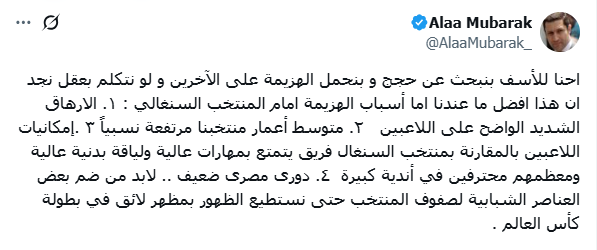 وعن أسباب هزيمة المنتخب في مباراة نصف النهائي لكأس الأمم الإفريقية، قال علاء مبارك: "أما أسباب الهزيمة أمام المنتخب السنغالي: