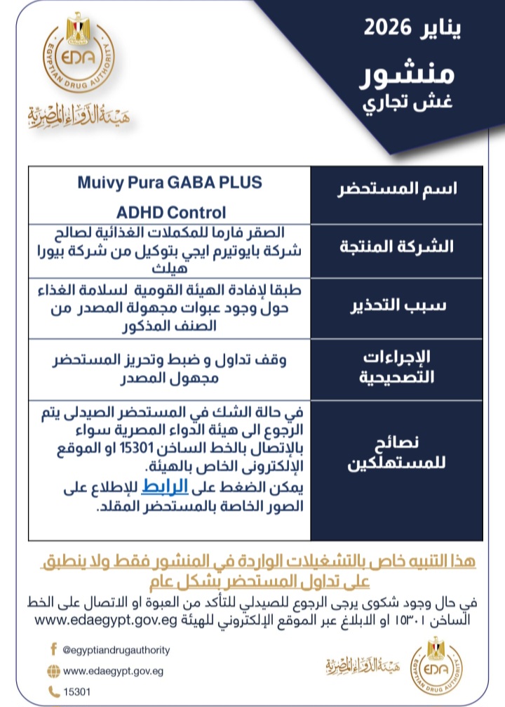 أصدرت هيئة الدواء المصرية، خلال يناير 2026، منشور غش تجاري بشأن مستحضر يحمل اسم Muivy Pura GABA PLUS، وذلك في إطار جهودها المستمرة لحماية صحة المواطنين وضمان مأمونية وجودة المستحضرات المتداولة بالأسواق.