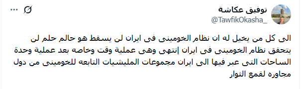وأكد توفيق عكاشة أن نظام "خامنئي" في إيران انتهى، زاعمًا أنه ستكون هناك عملية خاصة لذلك، بعد ما أطلق عليه بـ "عملية وحدة الساحات"، والتي زعم فيها أنه قد عبر إيران مجموعات من المليشيات التابعة للنظام الإيراني من دول مجاورة لقمع الثوار.